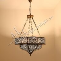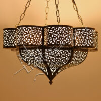 This iconic chandelier showcases the elegance of Moroccan design through its intricate eight-pointed star structure and double-layered formation. Crafted from solid brass and finished in a classic antique tone, the laser-cut pattern features traditional Islamic motifs that cast mesmerizing geometric shadows when illuminated.