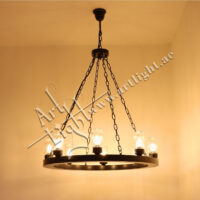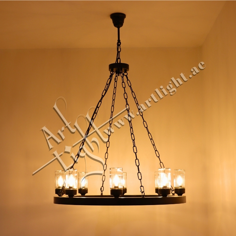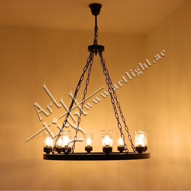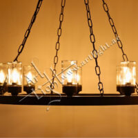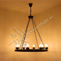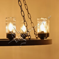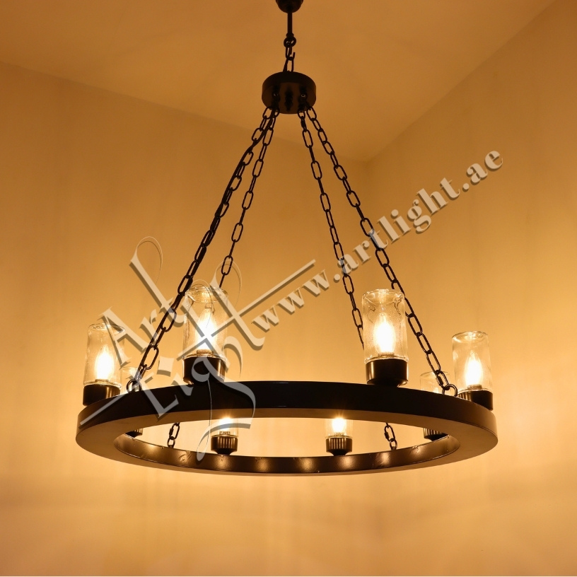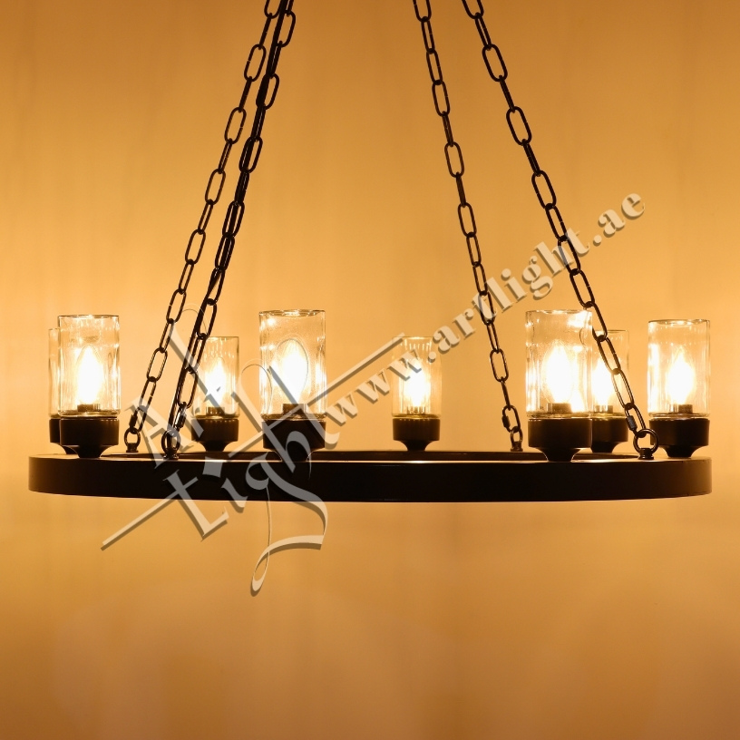 This robust outdoor chandelier blends durable construction with timeless simplicity. Designed with a solid iron ring and suspended by durable chains, it features multiple E27 light sources protected by clear cylindrical glass covers. The matte black or rustic bronze finish provides weather-resistant elegance suitable for outdoor courtyards, patios, entrances, or farm-style estates.