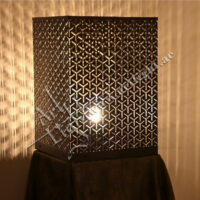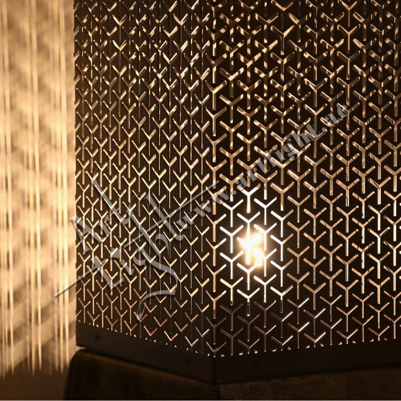 Elevate your interior with this handcrafted brass Floor lamp, featuring a stunning geometric seamless pattern. Precision laser-cut detailing casts mesmerizing shadows on surrounding walls, creating a warm and sophisticated ambiance. Ideal for living rooms, entryways, lounges, or hospitality spaces, this lamp combines traditional Islamic art with modern lighting design.