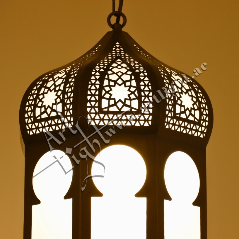 Inspired by traditional Islamic architecture, this dome-shaped hanging lantern features a pointed crown and arched frosted Acrylic panels framed in solid brass. The lantern’s distinctive silhouette mirrors mosque domes and minaret windows, while intricate laser-cut patterns along the crown and base add a refined decorative touch.