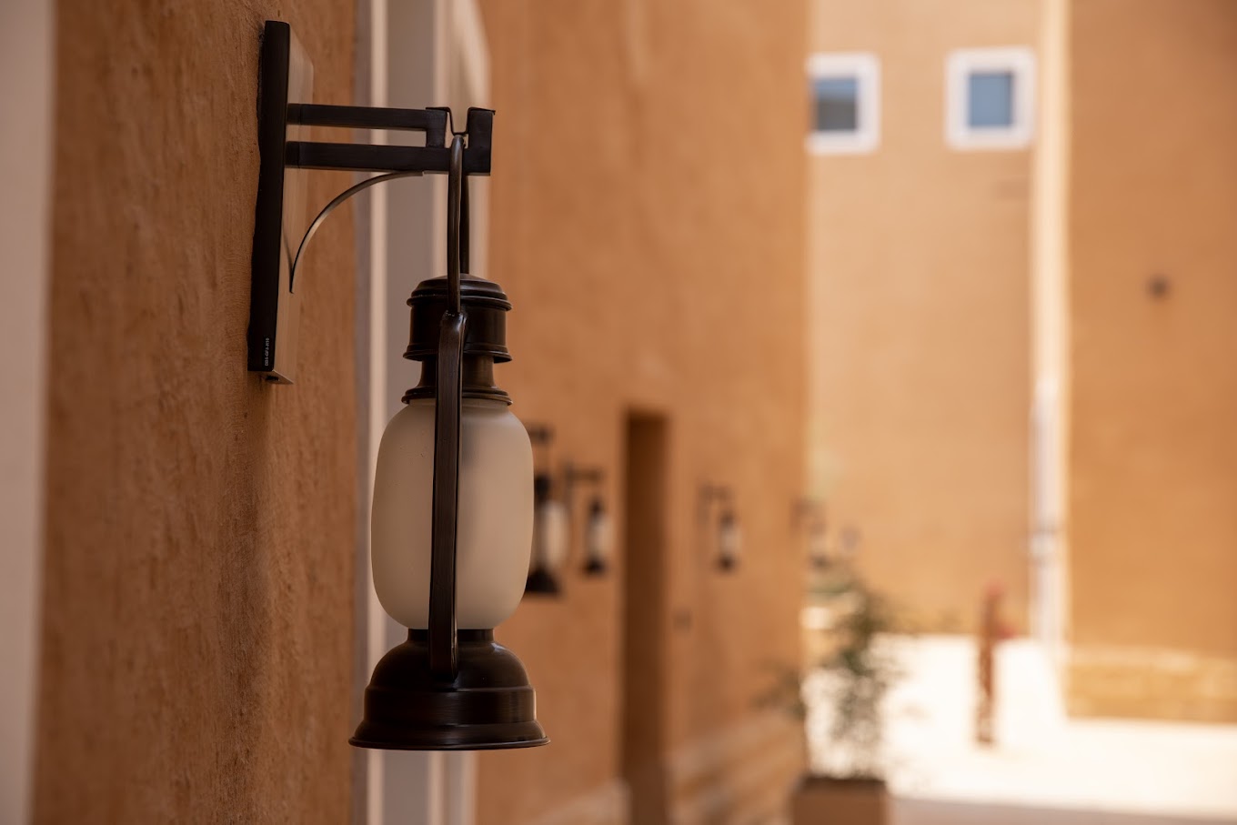 Vintage Lantern Wall Light – Brass Wall Sconce with Frosted Glass Shade (Bab Samhan Hotel, Diriyah)